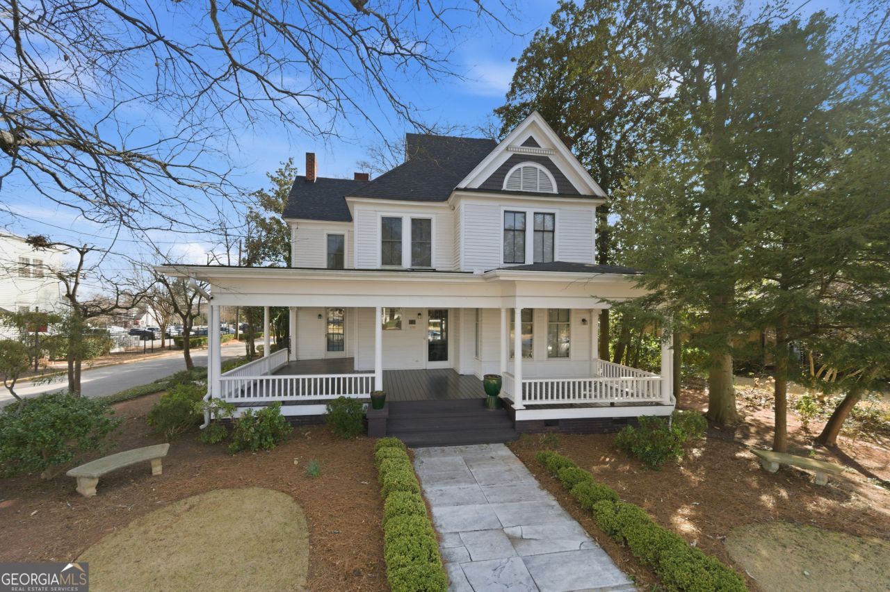 This charming single-family residence, currently used as a professional law office, offers exceptional versatility, solid construction, and an unbeatable location in Historic College Park, just a short walk from Woodward Academy, one of Atlanta's most sought-after private schools. Perfect for North Atlanta families seeking a home with great bones, a strong foundation, and long-term value, this property seamlessly blends classic character with flexible living spaces ideal for modern lifestyles. A beautiful, oversized wraparound porch spans the front and side of the home, perfect for relaxing in spring weather, entertaining guests, or hosting gatherings such as luncheons, book clubs, or intimate events. The home offers multiple points of entry: arrive through the inviting front foyer or pull into the private rear driveway with convenient access near the kitchen. Inside, a long central hallway leads to a guest bedroom and half bath on one side and a main-level owner's suite on the other, both filled with beautiful natural light. Formal living and dining rooms provide excellent entertaining spaces and currently function as conference and reception areas, easily transitioning back to elegant residential use. Upstairs, you'll find three additional bedrooms, including a second owner's suite, along with two full bathrooms. A versatile nook, currently used as a copy area, sits near a file room with existing plumbing access, offering the potential for a laundry room, expanded storage, or a future kitchenette. An adjacent bonus room is perfect for a gym, media room, or creative studio, with stairs connecting back to the main level for added flow. A partial basement awaits the next owner's vision, providing even more opportunity to expand living or recreational space. What truly sets this home apart is LOCATION! Situated in the heart of Historic College Park, the property offers walkability to Woodward Academy, a school prized by families across Atlanta for its academic excellence, strong community, and down-to-earth culture. Many families maintain a residence here specifically for school access, making this an exceptional opportunity for both homeowners and long-term investors. The property offers walkability, flexibility, and classic charm in one of Atlanta's most desirable school-focused neighborhoods, conveniently located just minutes from Hartsfield-Jackson Atlanta International Airport, major highways, and downtown Atlanta.